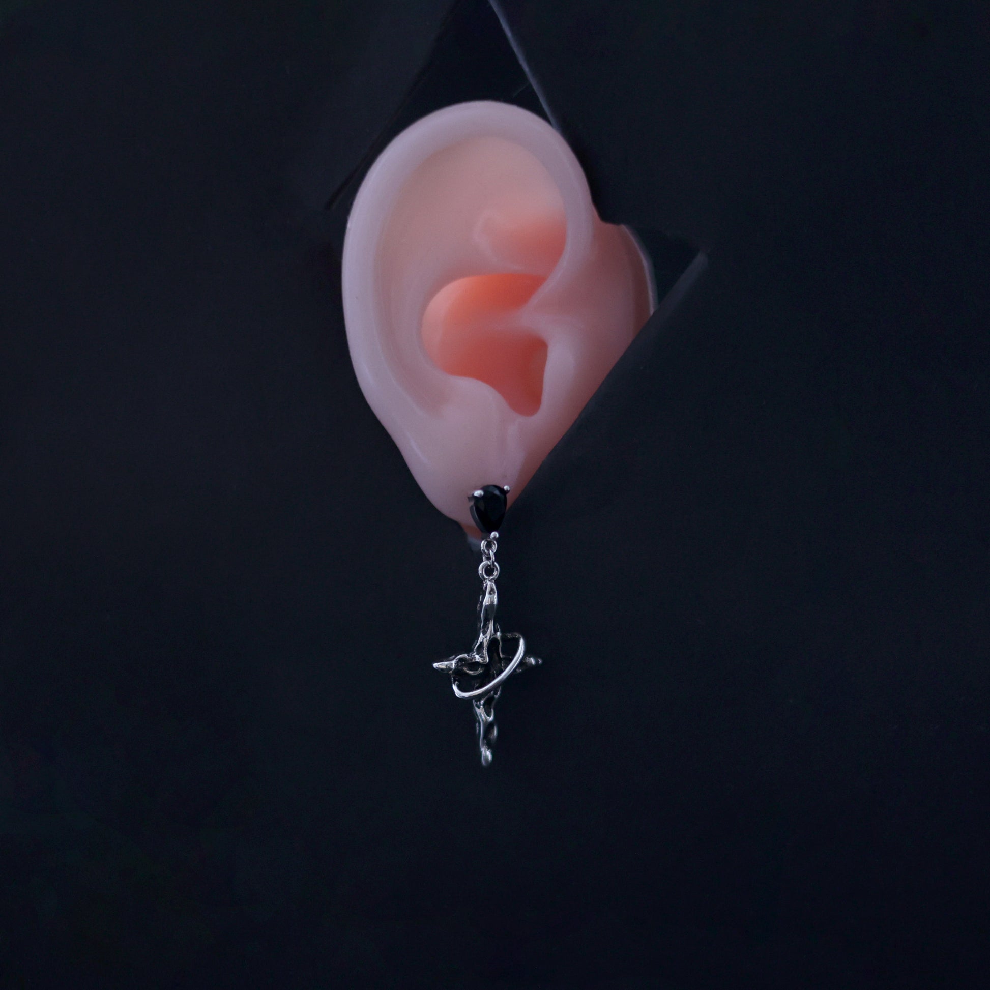 Silberfarbene Ohrhänger mit Kreuzform und schwarzem Tropfen-Anhänger.